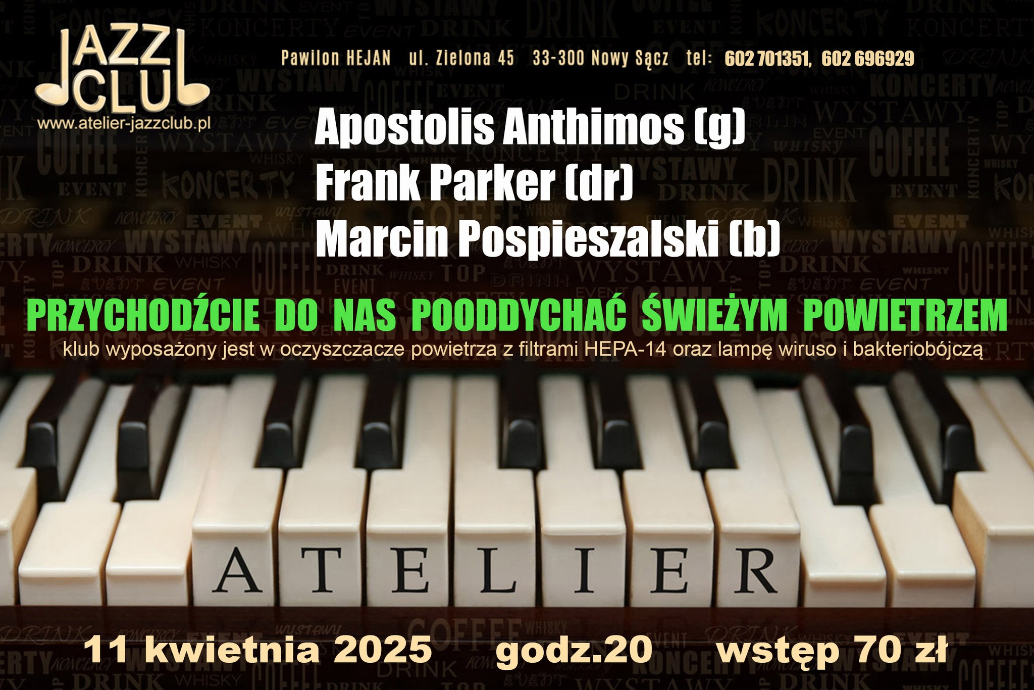 Apostolis Anthimos/ Frank Parker/ Marcin Pospieszalski Data 11 kwi 2025 Expired! Czas 20:00 - 20:00 Więcej informacji Czytaj więcej Lokalizacja ATELIeR jazz club Nowy Sącz, ul.Zielona 45 Czytaj więcej Poleć to wydarzenie